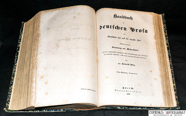 | Kurz, Heinrich [Hrsg.] Handbuch der deutschen Prosa von Gottsched bis auf die neueste Zeit. Historisch geordnete Musterstücke aus den vorzüglichsten Prosaikern ... nebst einem literarisch-ästhetischen Kommentar. Zürich: Meyer und Zeller, 1853. Drei Theile (in einem Band) XII, 851, 918, 512 Spalten. Fraktursatz. Halblderband der Zeit mit Rückenprägung. 4to. * Handbuch der deutschen Nationalliteratur; 4.-6. Theil. - Erste Abtheilung: Gottsched bis Kant. 1845. 2: Göthe bis auf die neueste Zeit. 1846. 3: Kommentar. 1853. - Einband berieben, Papier gebräunt und stockfleckig. Kurz Heinrich Hrsg | Deutsche Literatur | Anthologien | 1850-1899 | |