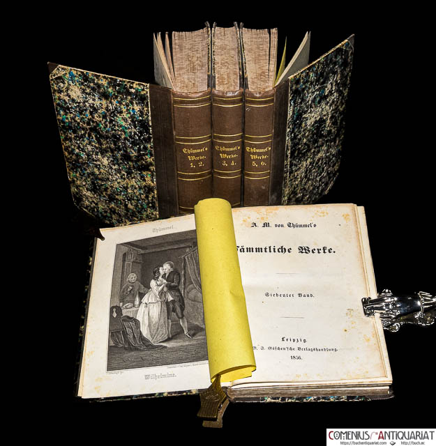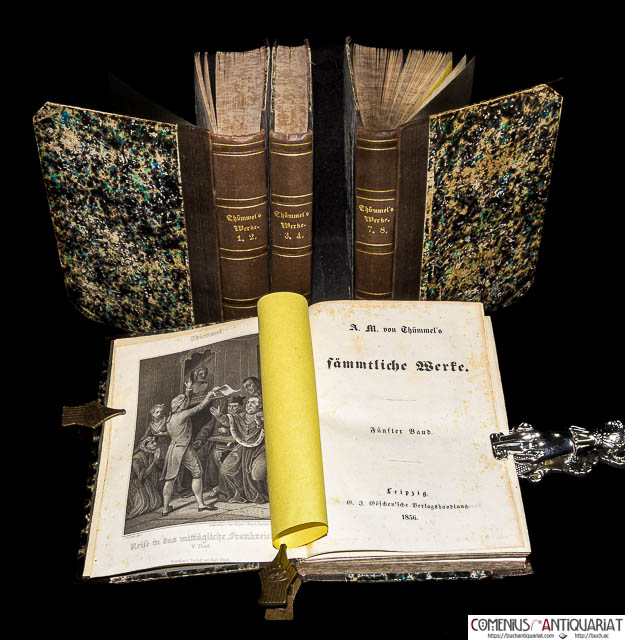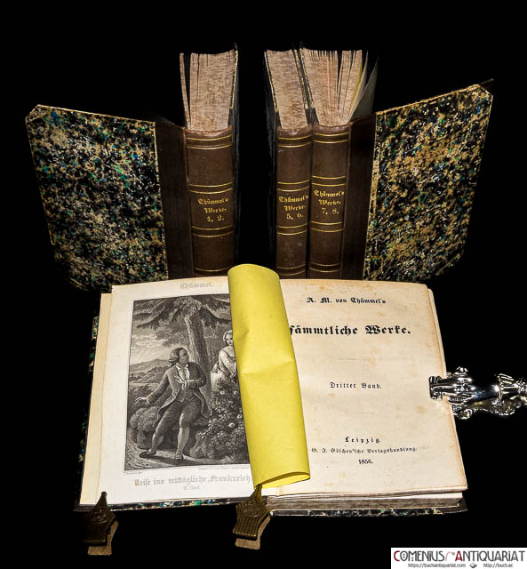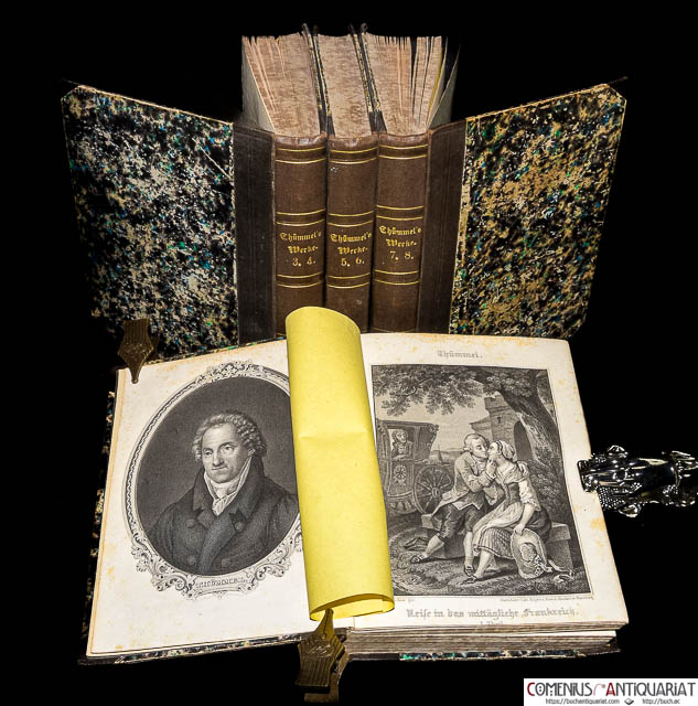 Moritz August von Thümmel (1738–1817) war ein einflussreicher deutscher Schriftsteller der Aufklärung und ein enger Zeitgenosse Wielands, dessen heiter-sinnlichen Stil er massgeblich mitprägte. Die bei Göschen erschienene Ausgabe seiner «Sämmtlichen Werke» (1856) umfasst sein schmales, aber literarhistorisch bedeutendes Œuvre. Sein Hauptwerk ist der Roman «Reise in die mittäglichen Provinzen von Frankreich» (1791–1805; hier in den Bänden 1-7), der weniger eine reale Reisebeschreibung als vielmehr ein fiktionaler, oft frivoler und humorvoller Empfindsamkeitsroman in der Tradition von Laurence Sterne ist. Ein weiteres bekanntes Werk ist das komische Epos «Wilhelmine» (1764; hier in Band 7), das den steifen Hof- und Beamtenadel seiner Zeit parodiert. Thümmel, der lange als Minister in Coburg wirkte, galt seinen Zeitgenossen als Meister der galanten und eleganten Prosa, wurde jedoch wegen der teils lüsternen Untertöne seiner Texte auch kritisiert. Der abschliessende 8. Band enthält Vermischte Gedichte,Die Inoculation der Liebe, Das Erdbeben von Messina und Nachrichten von Thümmels Leben. | ||||